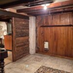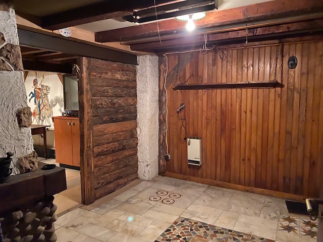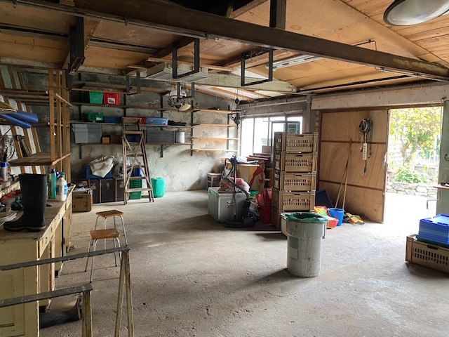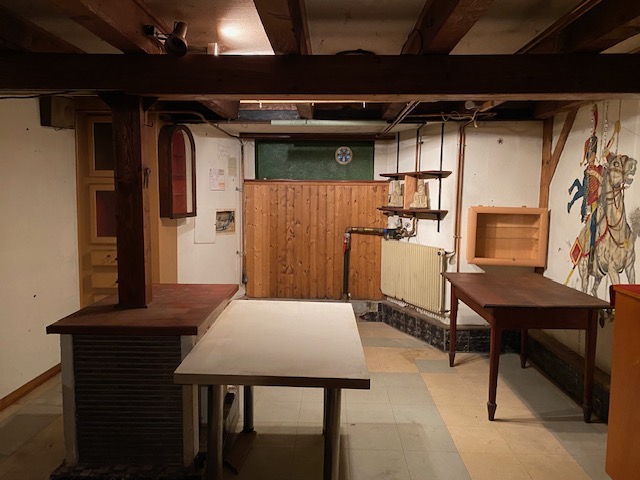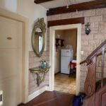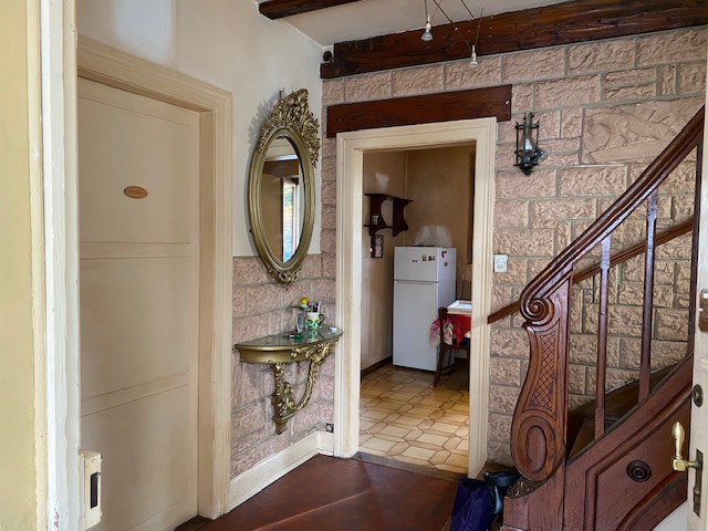 Une entrée donnant accès à une cuisine aménagée (accès direct extérieur), une salle à manger et un salon agrémenté d’une cheminée. Un WC